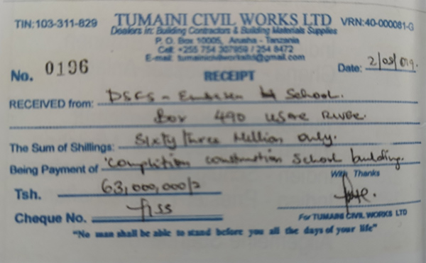 Freude gab es unter Schüler und Lehrern der Grundschulein Maji Chai/Tansania/Afrika. Mit Hilfe von The Life to Share e.V. konnte die Schule fertig gestellt werden. Im Juli 2019 haben wir die Spendensumme von 25.000 Euro nach Tansania überwiesen (siehe Beleg. Nur drei Monate später, erreichte uns die Nachricht, dass die Schule in Arusha fertig ist und vom Bischof eingeweiht wurde.